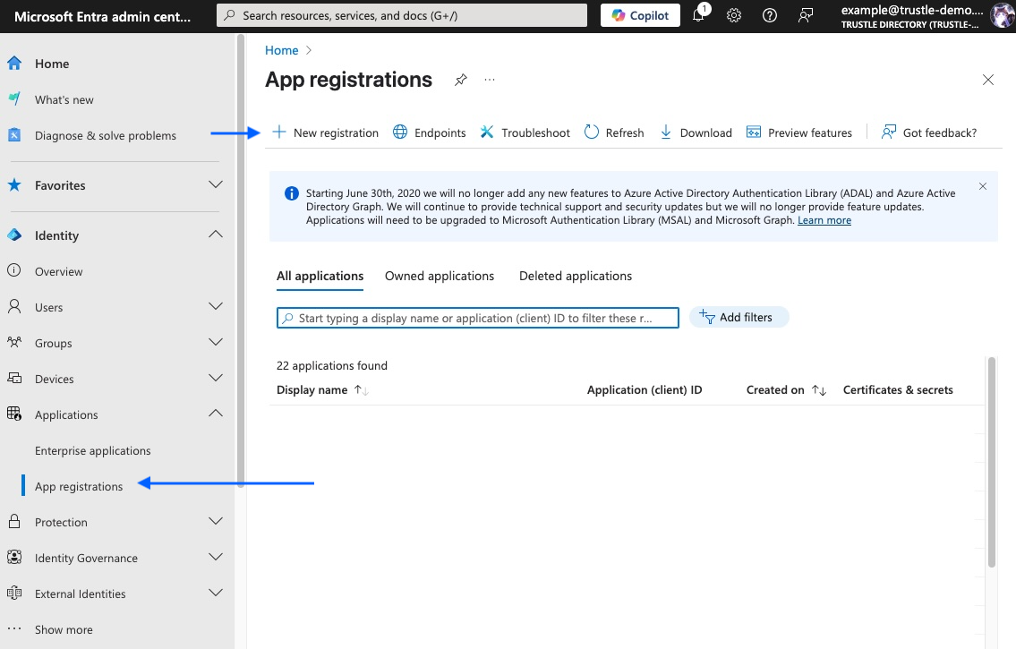 - In Entra Admin Center, go to "Applications" > "App registrations"