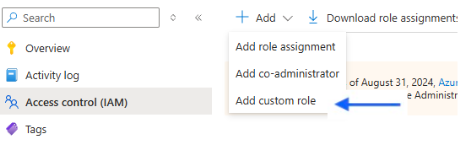 - In your subscription, click “Access control (IAM) and “Add a custom role”