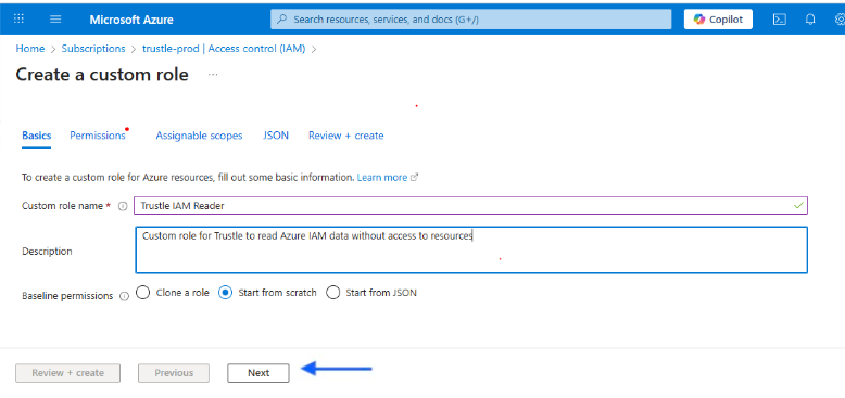 - Select a name like “Trustle IAM Reader” and click “Start from scratch”. Then click “Next”